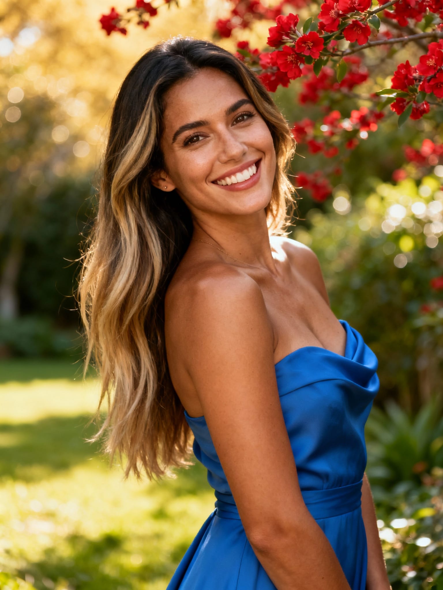 Smiling woman in a gold dress